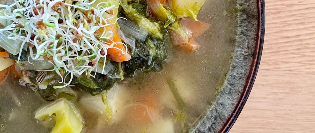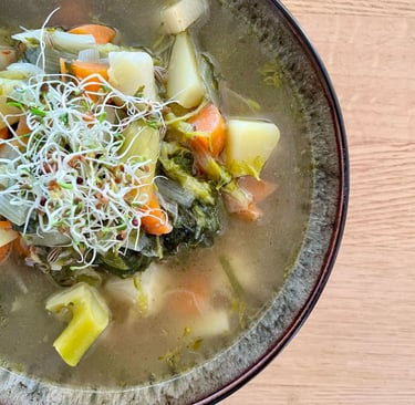 Ajouter environ 3 bols d'eau, l'alliaire, un peu de sel Herbamare ou un demi bouillon et laisser mijoter environ 30 min jusqu'à ce que les légumes soient cuites.