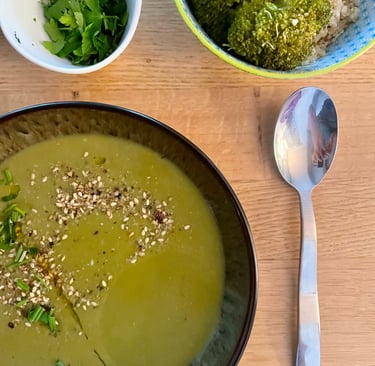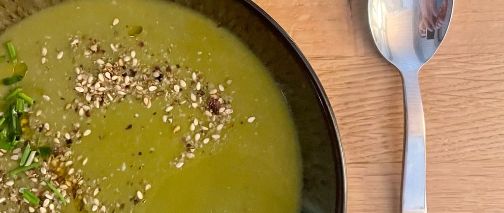 Passer au mixeur et déguster saupoudré d'un peu de vāta cūrṇa by Suryaveda et d'aromates fraîches.