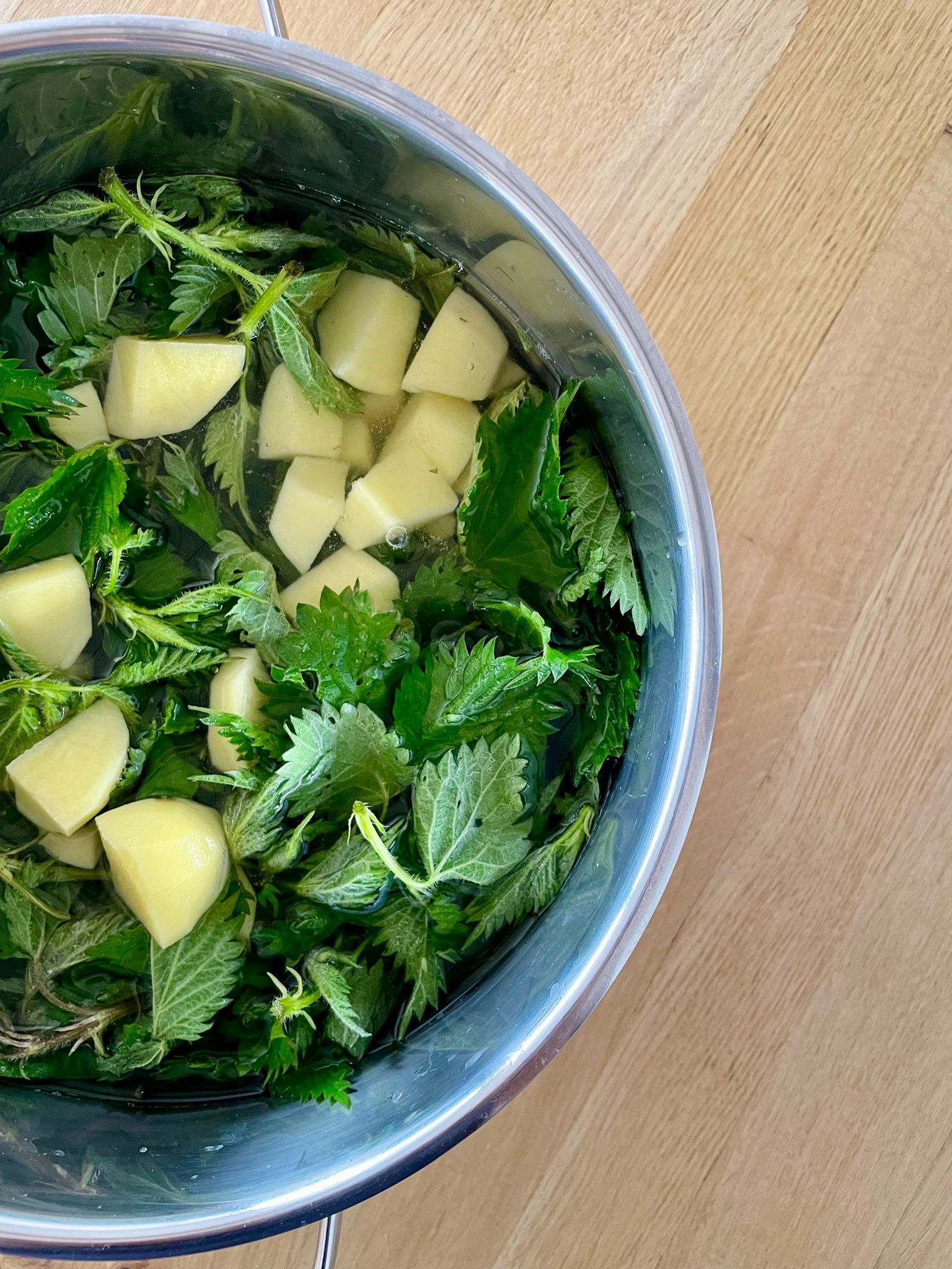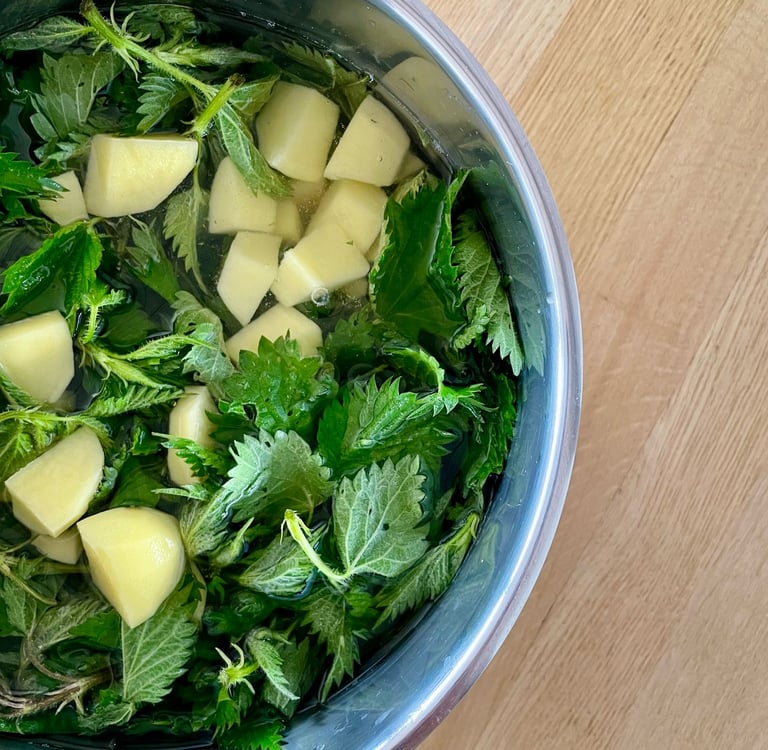 Commencer par préparer le vaghar (fond d'épices): dans une casserole, faire chauffer l'huile. Une fois chaude, ajouter les épices. Les faire dorer quelques instants puis ajouter la pomme de terre coupée en dés et les orties.